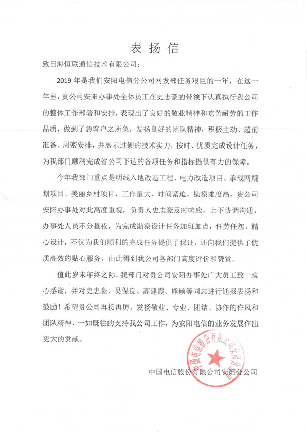 轉發(fā)“中國電信股份有限公司安陽分公司”對我公司員工的一封表揚信