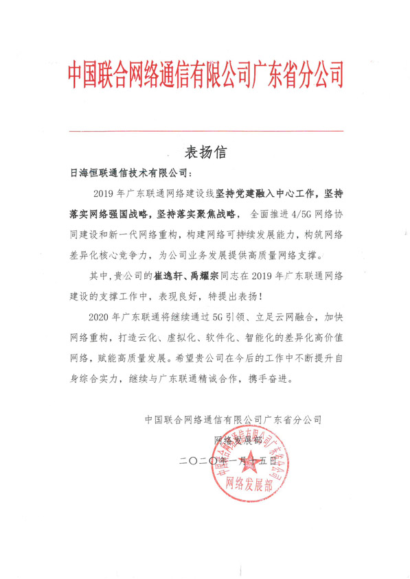轉發(fā)“中國聯(lián)合網絡通信有限公司廣東省分公司網絡發(fā)展部”對我公司員工的一封表揚信